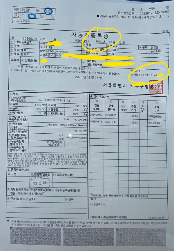 파주의 용달 넘버를 성북구로 이전하여 드렸습니다.