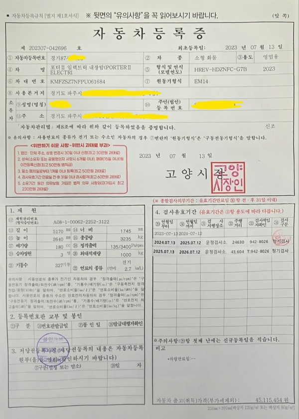 26년 3월 10일 기아 pv5카고 남바랑을 통해서 했어요.