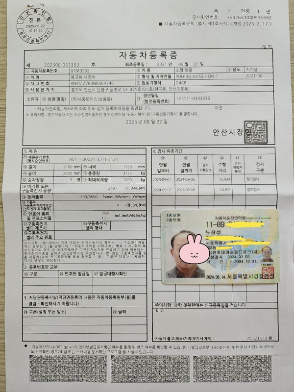 2025년9월12일 봉고1톤 영업용 넘버 매입후기