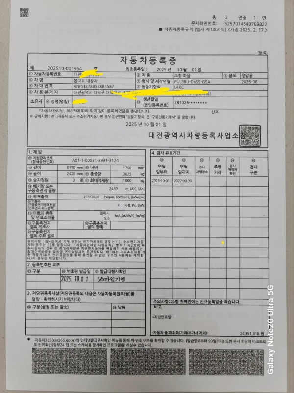 매수인님은 대전에서 우체국 택배를 하시기 위해 신차를 구매하셨구요..