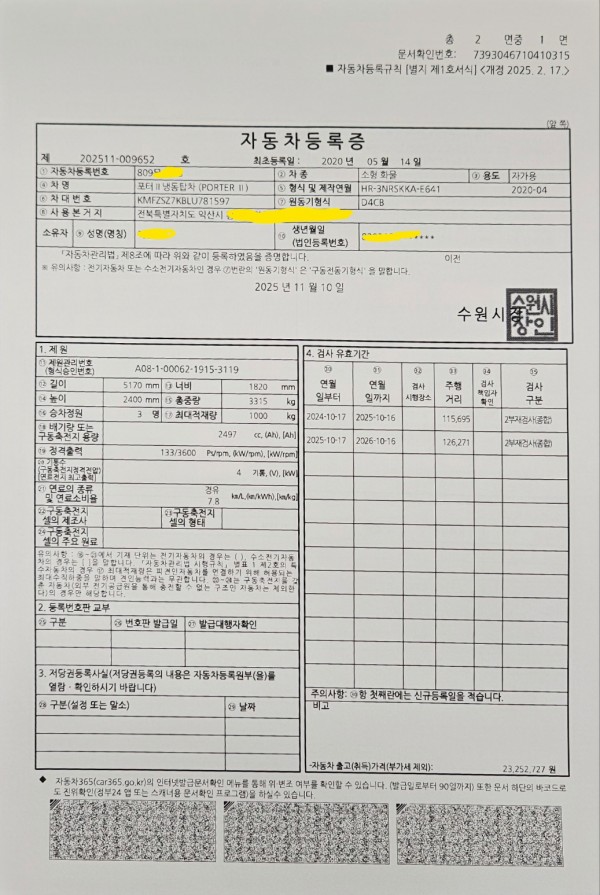 25년 11월 21일 개인용달 구매후기입니다(11월20일 익산에서)