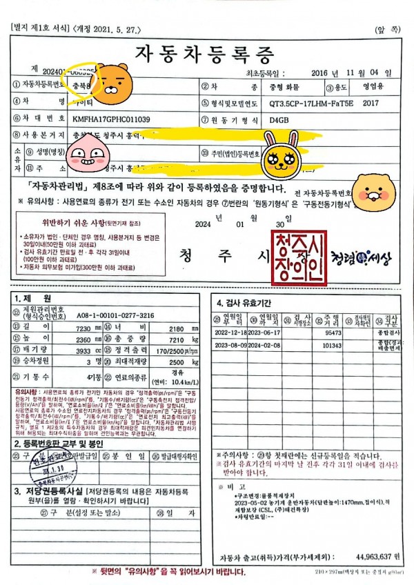 청주의 개별넘버를 시흥으로 이전였습니다...