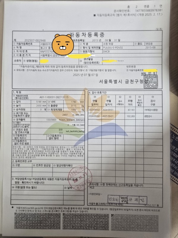 송파의 용달 넘버를 서울 금천구로 이전 하였습니다..( 같은 서울 지역이라 번호 변경 없이 이전. )