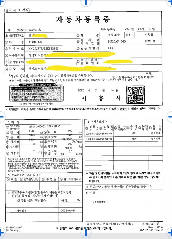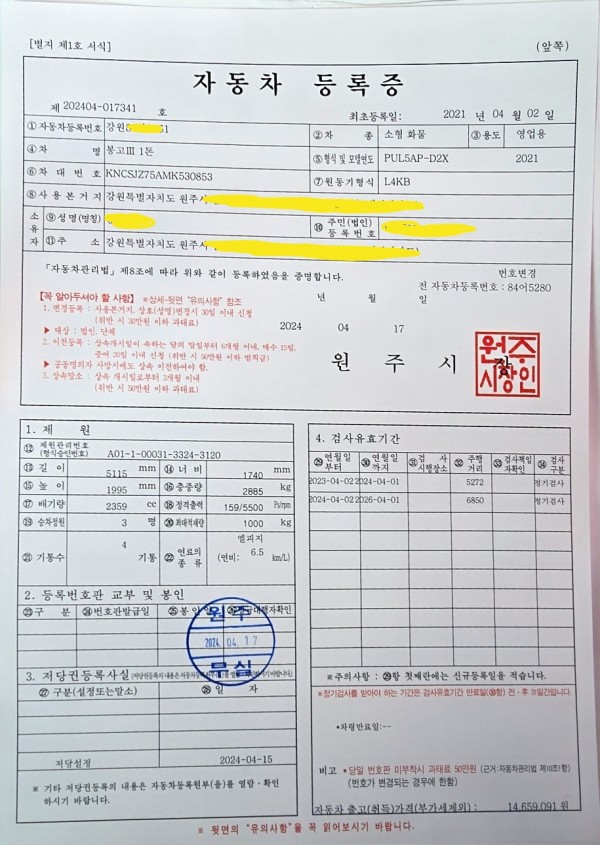 강원도 매도인분의 용달 넘버를 경기도의 매수자 분으로 이전 하여 드렸습니다.